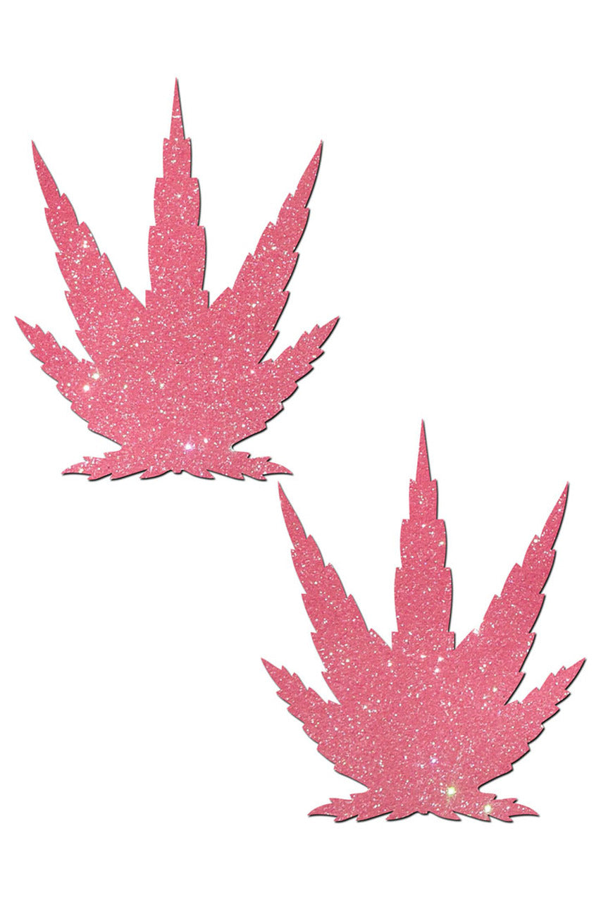 Give a sweet taste in these Bubblegum Pink Glitter Pot Leaves Nipple Pasties that feature a durable no-mess glitter pleather that forms to curves and resists wrinkling over hardening nipples.