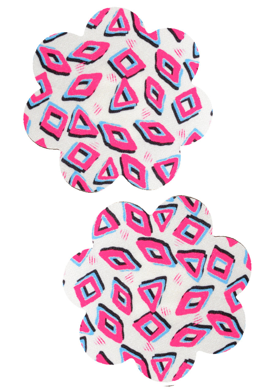 White petal nipple pasties with hot pink and blue diamond print. Feature self adhesive tape, just peel and stick on clean, dry, oil-free skin.