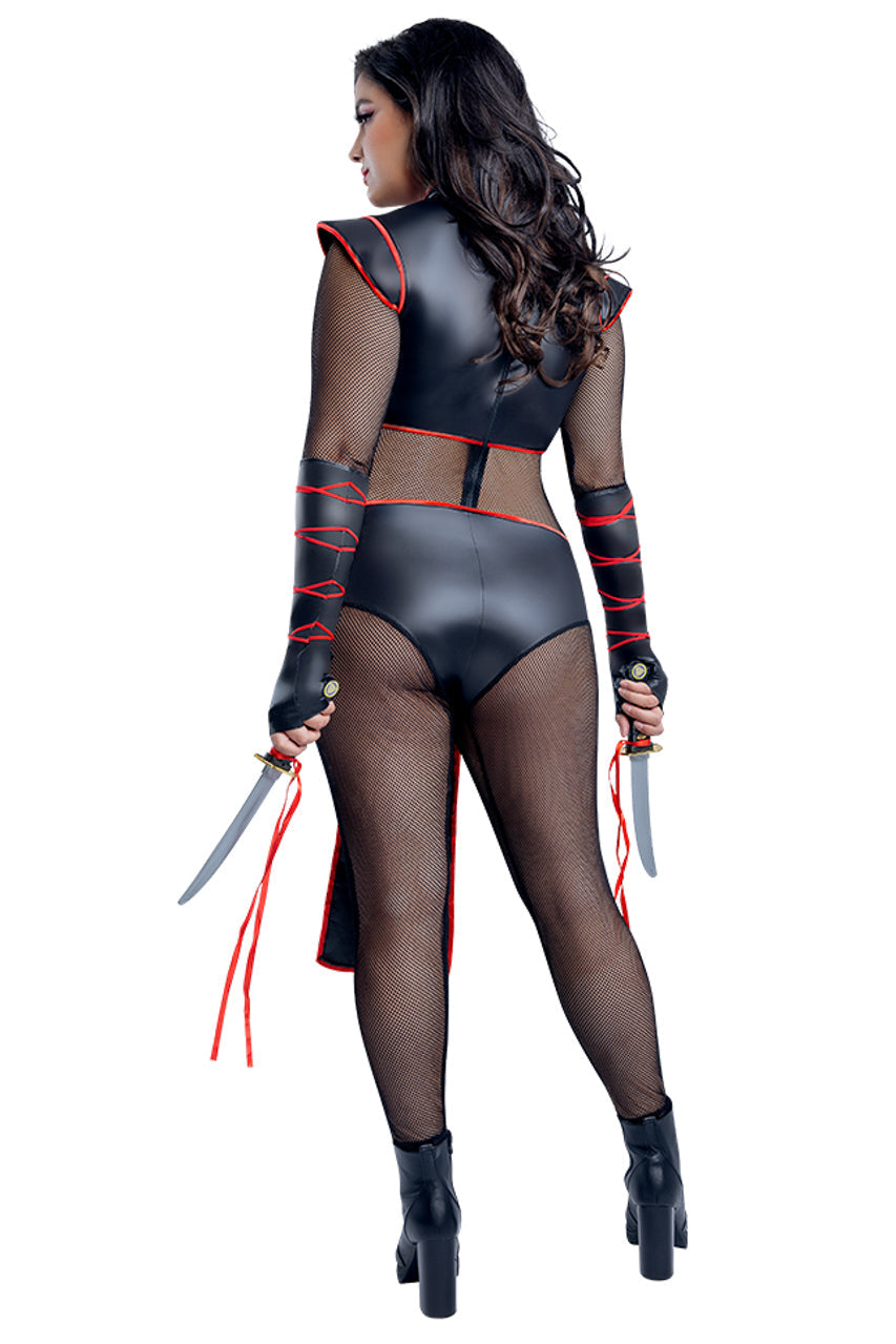 Who says larger women can't resemble the deadliest assassins? A fishnet cutout bodysuit with vinyl and structured shoulders, a long front peplum with a dragon pin, a face mask, gloves, and toy swords are all included in this attractive assassin costume for plus-sized women. It has a wet-look finish, red piping, and is made of stretchy spandex-blend fabric for a brilliantly fiery effect! C