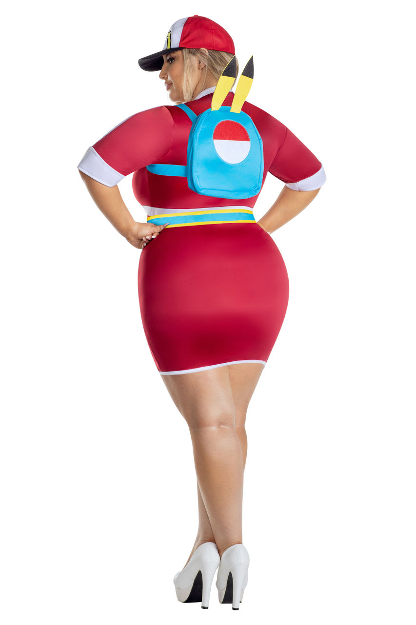 Catch 'em all in this plus size Beast Trainer costume featuring a red mini dress with white and blue trim detail, character backpack, and hat.