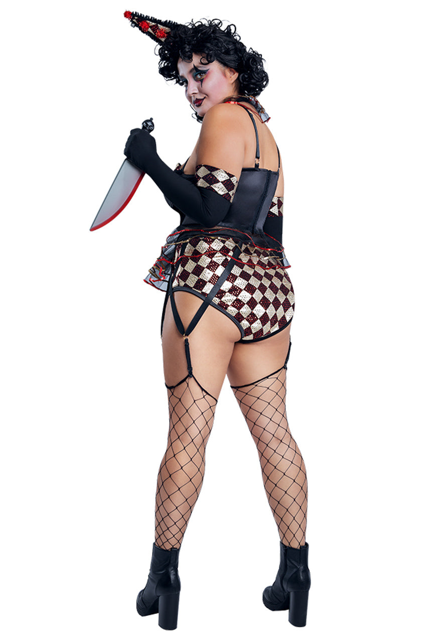 Get the Creepy Jester look without the clown responsibilities. This costume includes a spandex bodysuit that is dri-wey and breathable, as well as diamond print patterns on the front and along the bust. The wet look pattern enhances the sultry appearance of this killer costume. The collar and waist tulle ruffles add a playful touch. This set is completed by a toy knife, black gloves with a wet appearance, and a clown hat. (Stockings not included.)