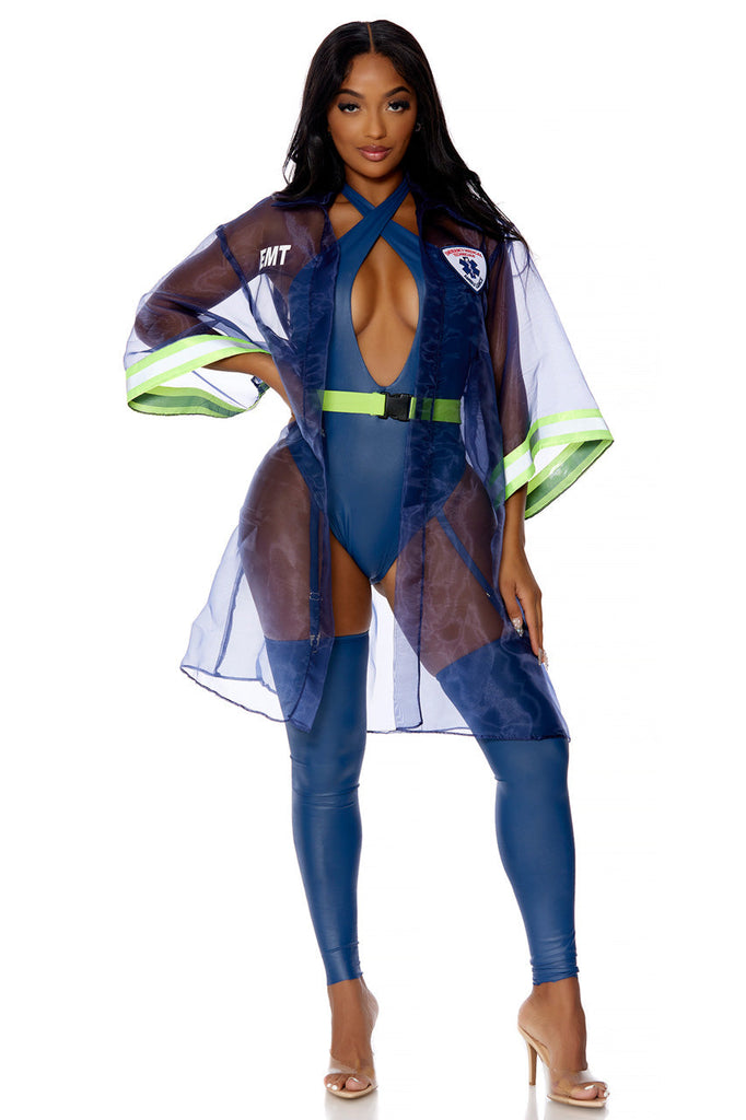 This five-piece, Sexy Paramedic costume includes a blue bodysuit with a halter neck, open bust, matching leg accessories, a contrast pinch buckle belt, a sheer blue oversized jacket with patches, and a vinyl bag with emblem print.