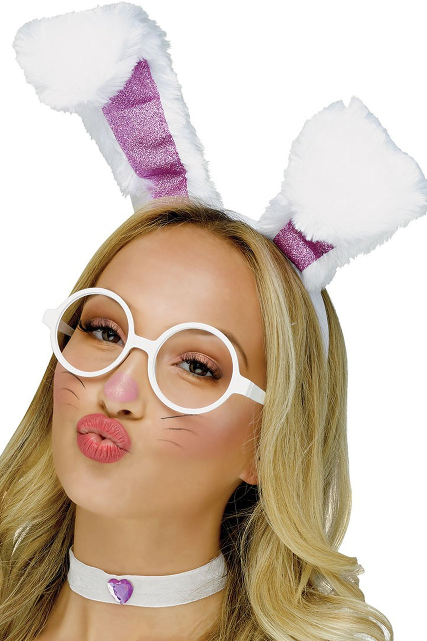 - White fuzzy bunny ears headband with pink glitter